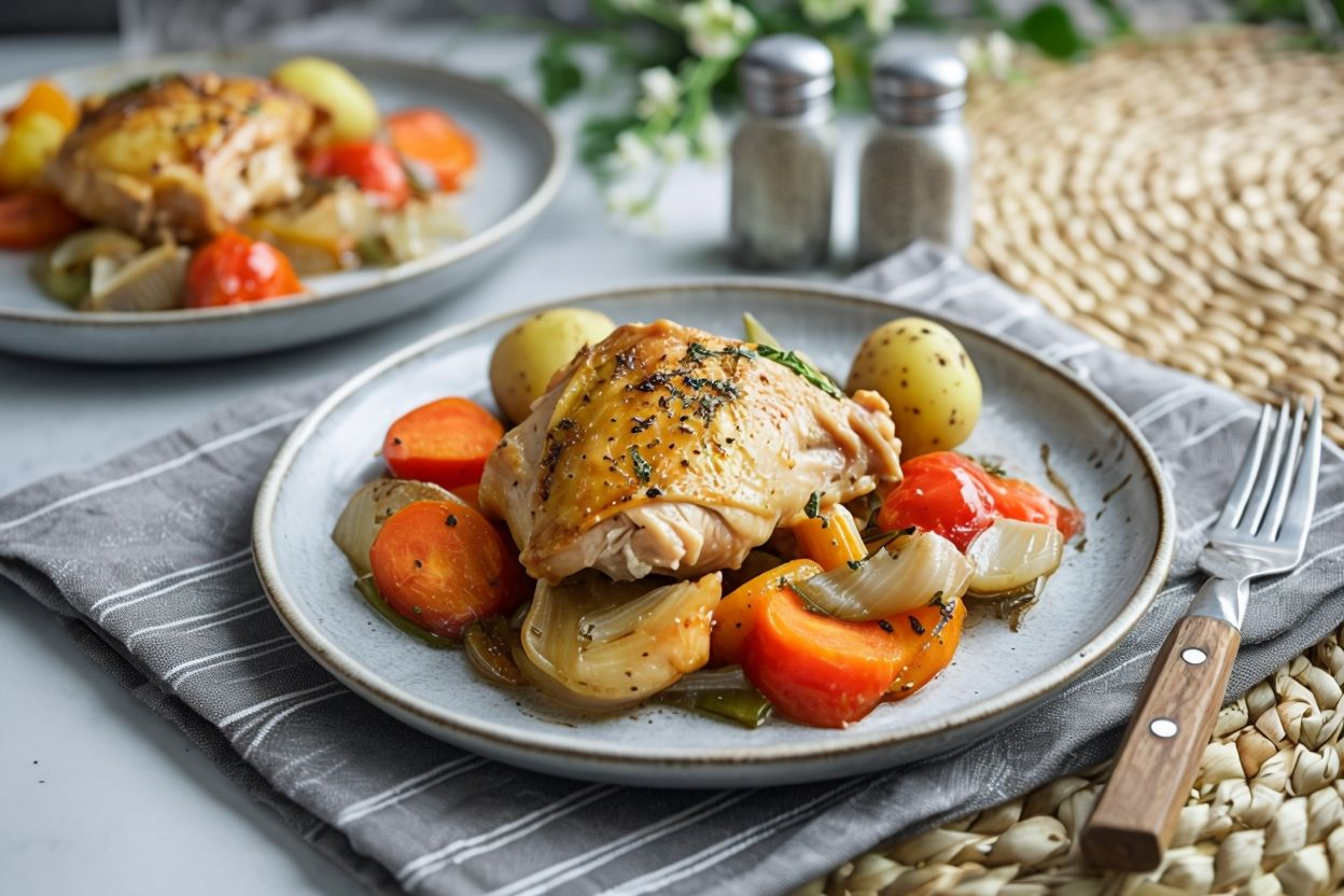 Con esta receta, disfrutarás de unos contramuslos de pollo jugosos y llenos de sabor, acompañados de una combinación perfecta de verduras y patatas que realzan su textura y aroma. Este plato es ideal para cualquier ocasión, ya sea un almuerzo familiar o una cena reconfortante.