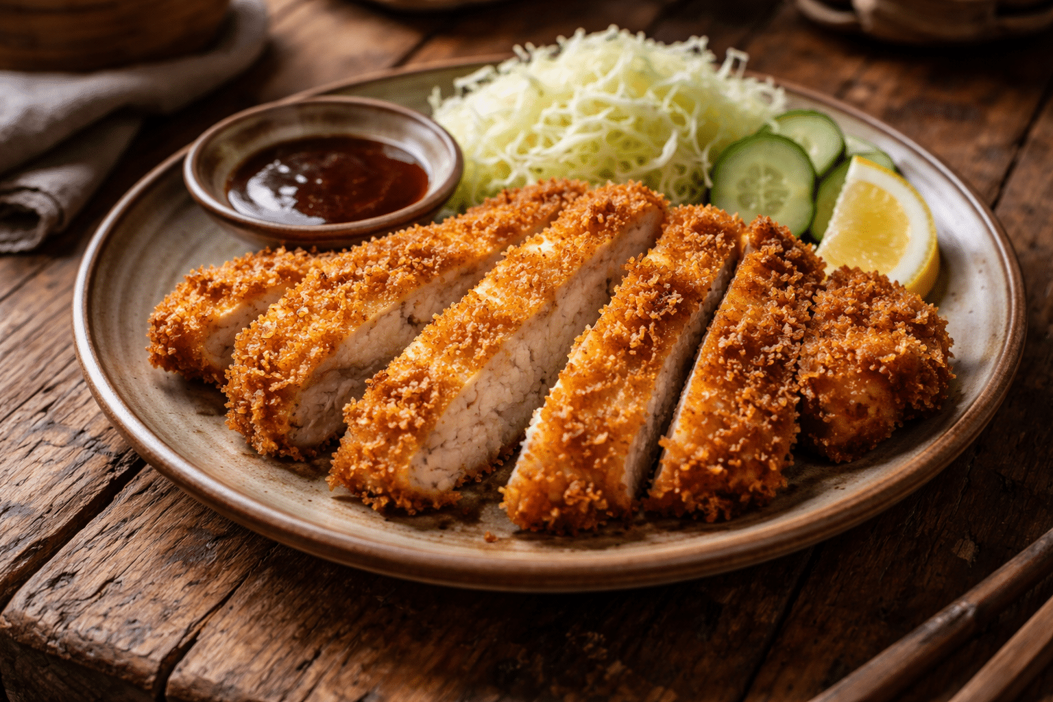Lo más clásico es arroz blanco y ensalada de col, pero también puedes servirlo en bocadillo, sobre curry japonés o acompañado de verduras salteadas. También combina muy bien con una ensalada ligera y fresca que equilibre el crujiente del rebozado.